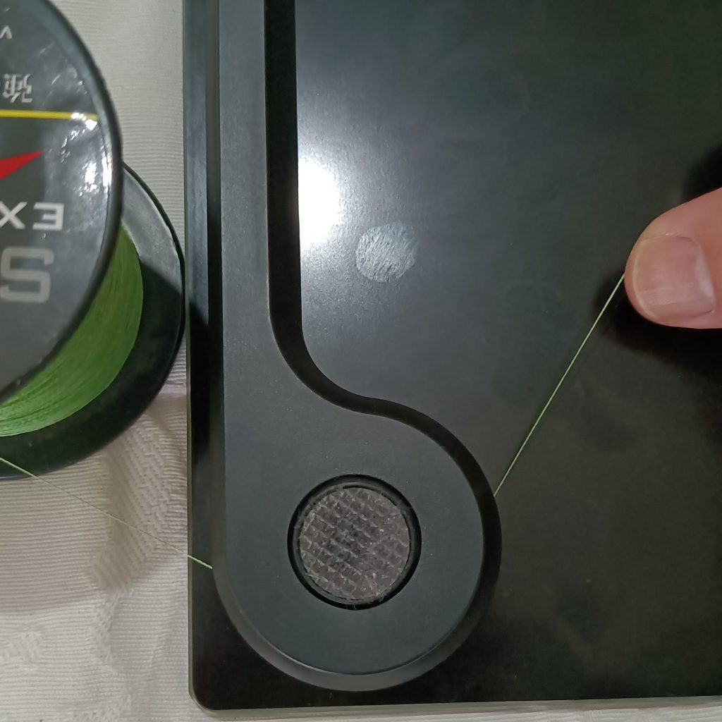 Para despegar los puntos de unión de los sensores con la base de cristal de la báscula puede usar un hilo de pescar. En este caso usé un hilo o seda de pescar trensado.