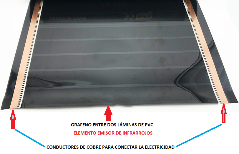 El baño de grafeno y plata de los folios infrarrojos está metido entre dos láminas de PVC con dos tiras de cobre a cada lado.
